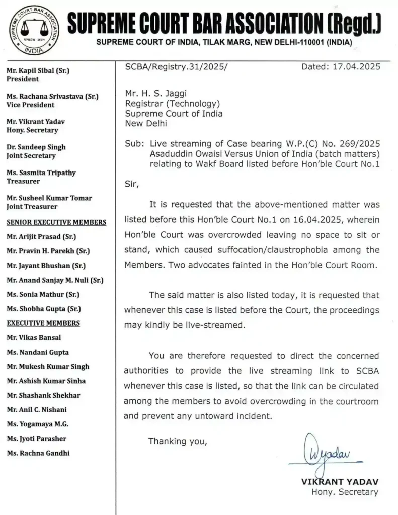 The Supreme Court Bar Association (SCBA) has submitted a request to the Supreme Court, urging for the live streaming of hearings related to the petitions challenging the Waqf Amendment Act, 2025.