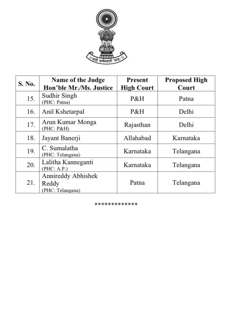 Justice Lalitha Kannegani (parent High Court: Andhra Pradesh) has been shifted to Telangana High Court. - From Allahabad High Court: